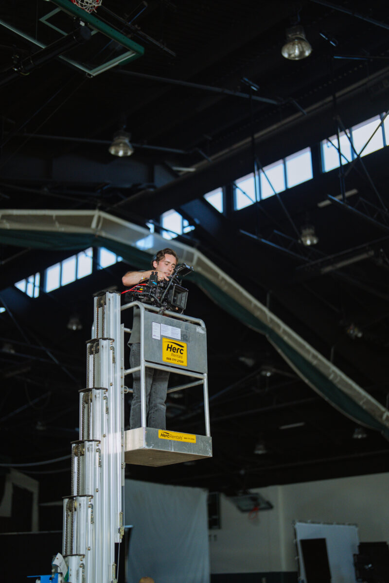 Our camera and G&E teams reinforced the clean, futuristic aesthetic with controlled lighting and a 20×20’ white seamless backdrop that unified the rotating platform and plexiglass sets. A mast lift was used not only to adjust lighting at ceiling height but also to capture elevated angles of Stephen shooting and the ball dropping through the hoop.